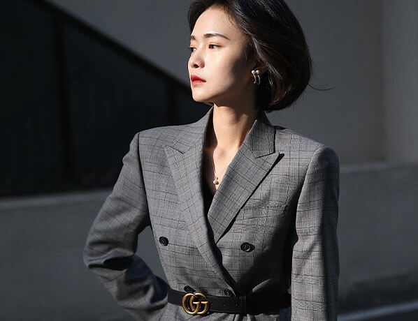 女士淺灰色網(wǎng)格雙排扣同款西服定制